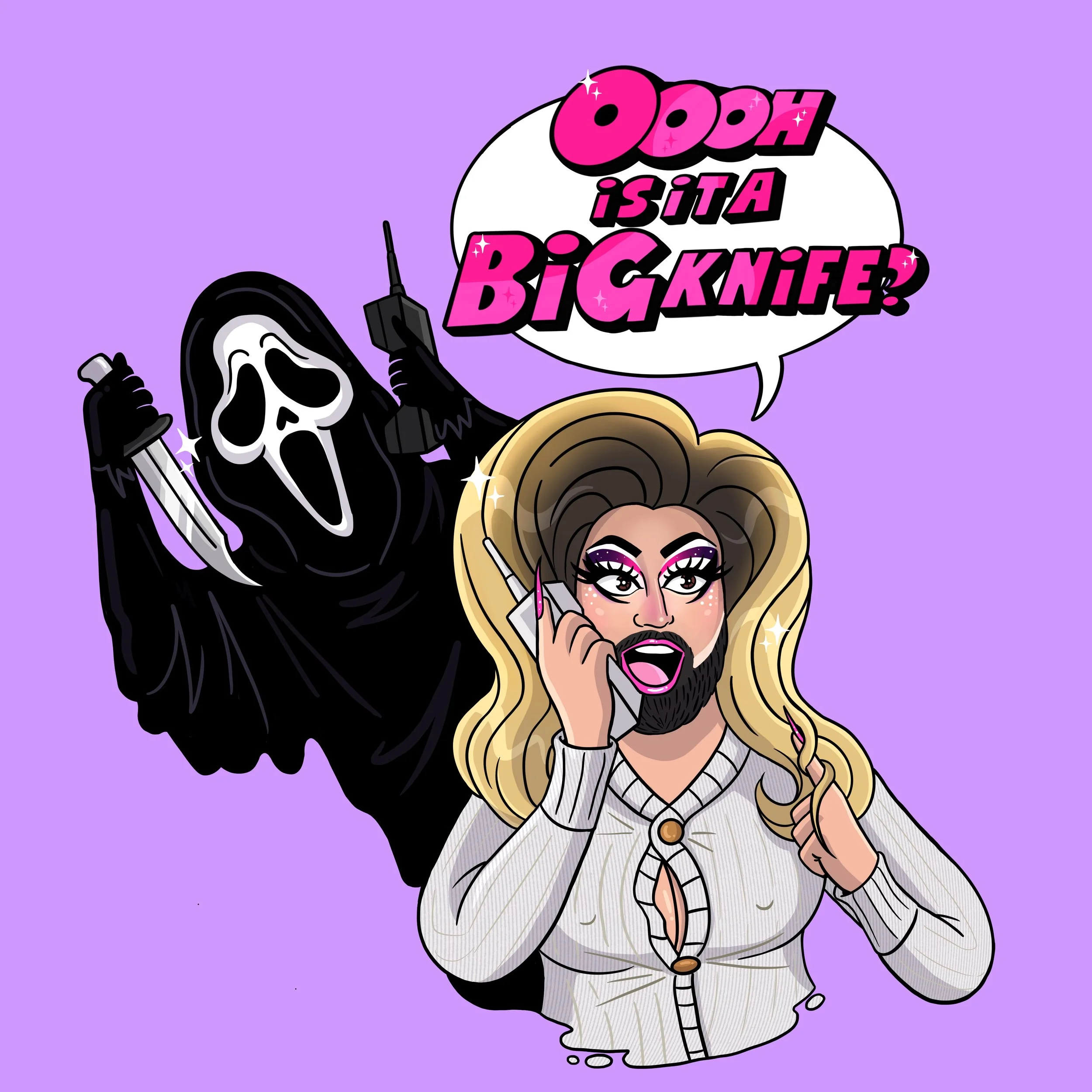 Logo and illustration design created for Florida based Drag Queen, Tara Newhole. The designs are based off her viral video parodying Carmen Electra’s scene in Scary Movie. The designs capture their campy, vibrant personality and have been used for merchandise materials and social media branding.